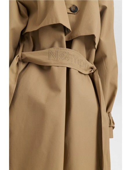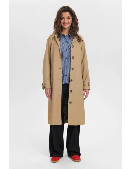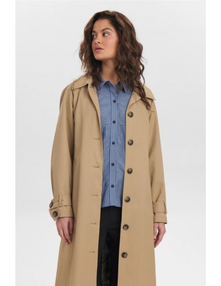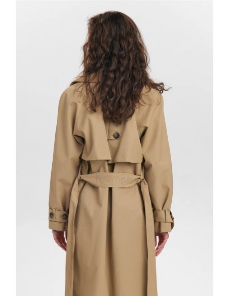 Gabardina abotonada de largo midi, con bolsillos y forro interior. En la parte trasera consta de un pliegue con botón, lazada para atar y abertura.