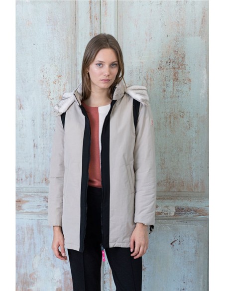 Parka de mujer en color beige, realzada con elegantes franjas negras en el frontal y la capucha. Su forro de suave pelo sintético en la capucha aporta un toque de calidez y sofisticación. Diseñada para el invierno urbano, esta parka combina protección térmica, tejido resistente al viento y corte femenino ligeramente entallado para realzar la figura. Los bolsillos laterales y el cierre central con cremallera garantizan comodidad y funcionalidad.