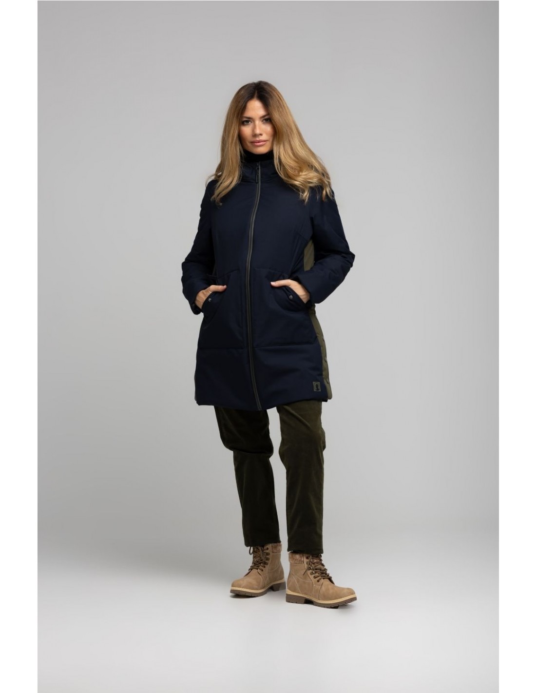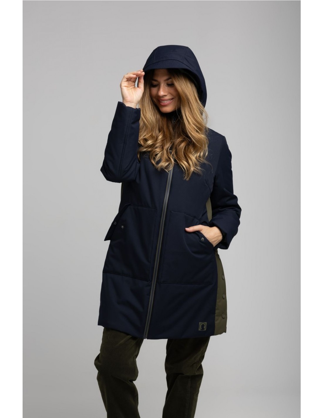 Parka azul marino con detalles en verde militar, de largo midi, con dos capuchas (una extraíble). Bolsillos delanteros y cierre frontal con cremallera termosellada de doble dirección. Lateral con corchetes.