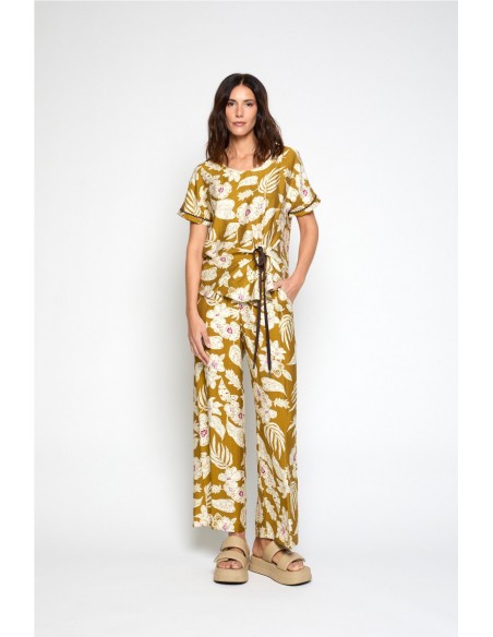 Blusón de manga caída con nudo en la delantera, confeccionado en viscosa con estampado de flores. Escote a la caja. Lleva detalles de cinta zigzag en los puños. Combínalo con el Pantalón Gaia para un total look. Composición: 80% viscosa 20% poliamida