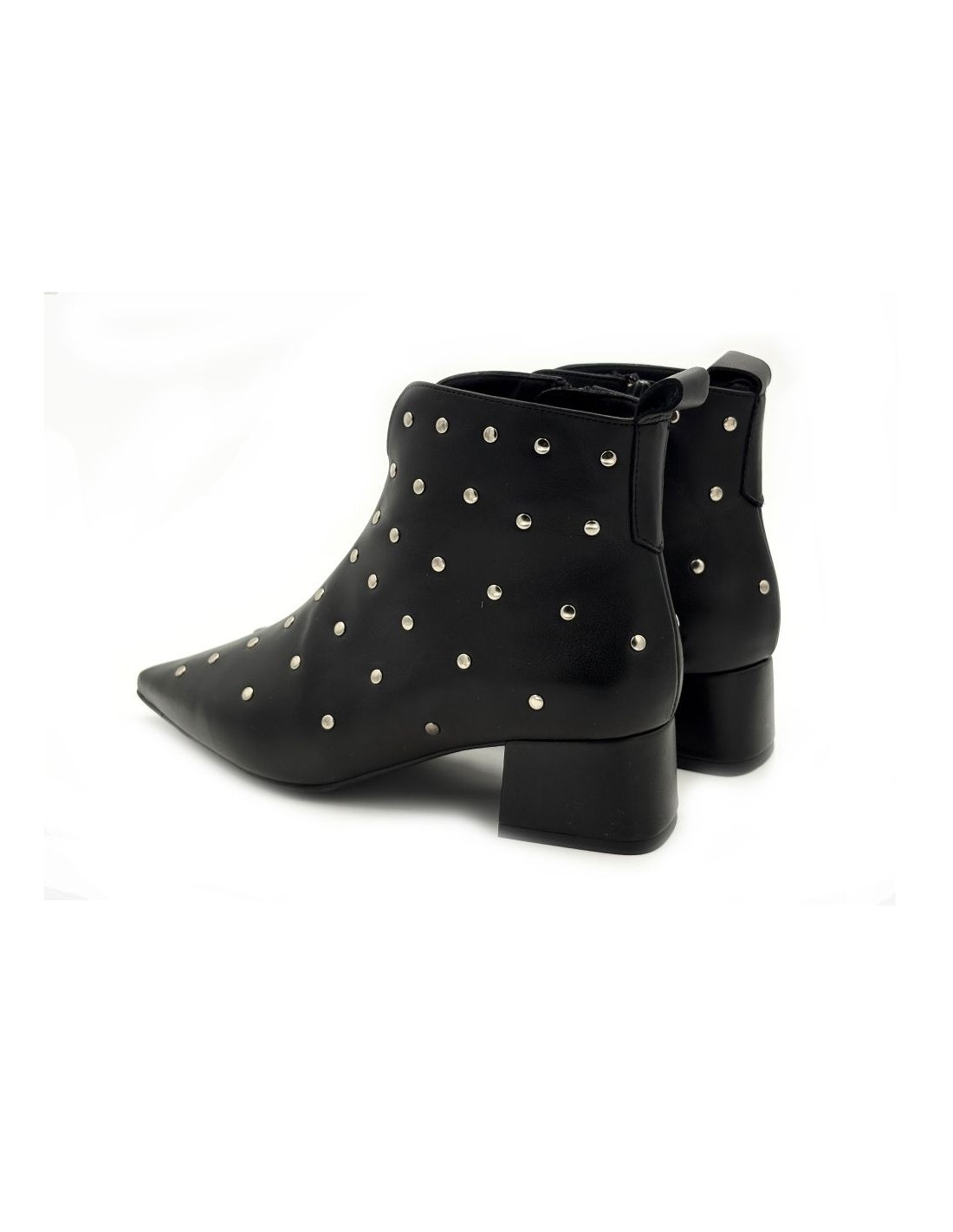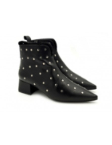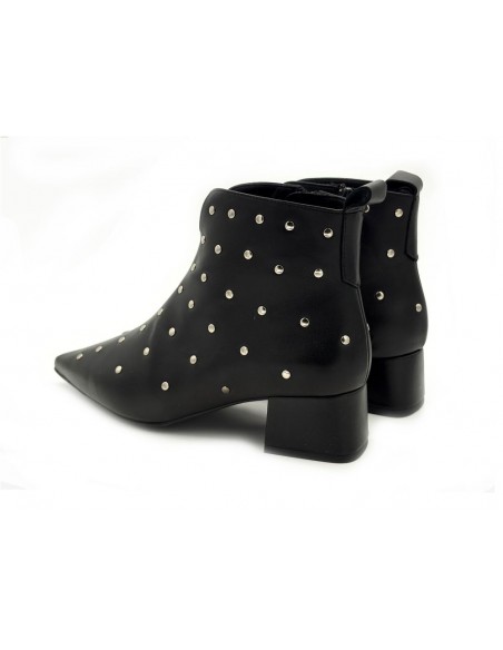 Botín fabricado en piel, en color negro, con tacón de 5cm. Plantilla de tejido acolchada, suela de goma y cierre con cremallera. Altura de caña 14cm y contorno 10cm.