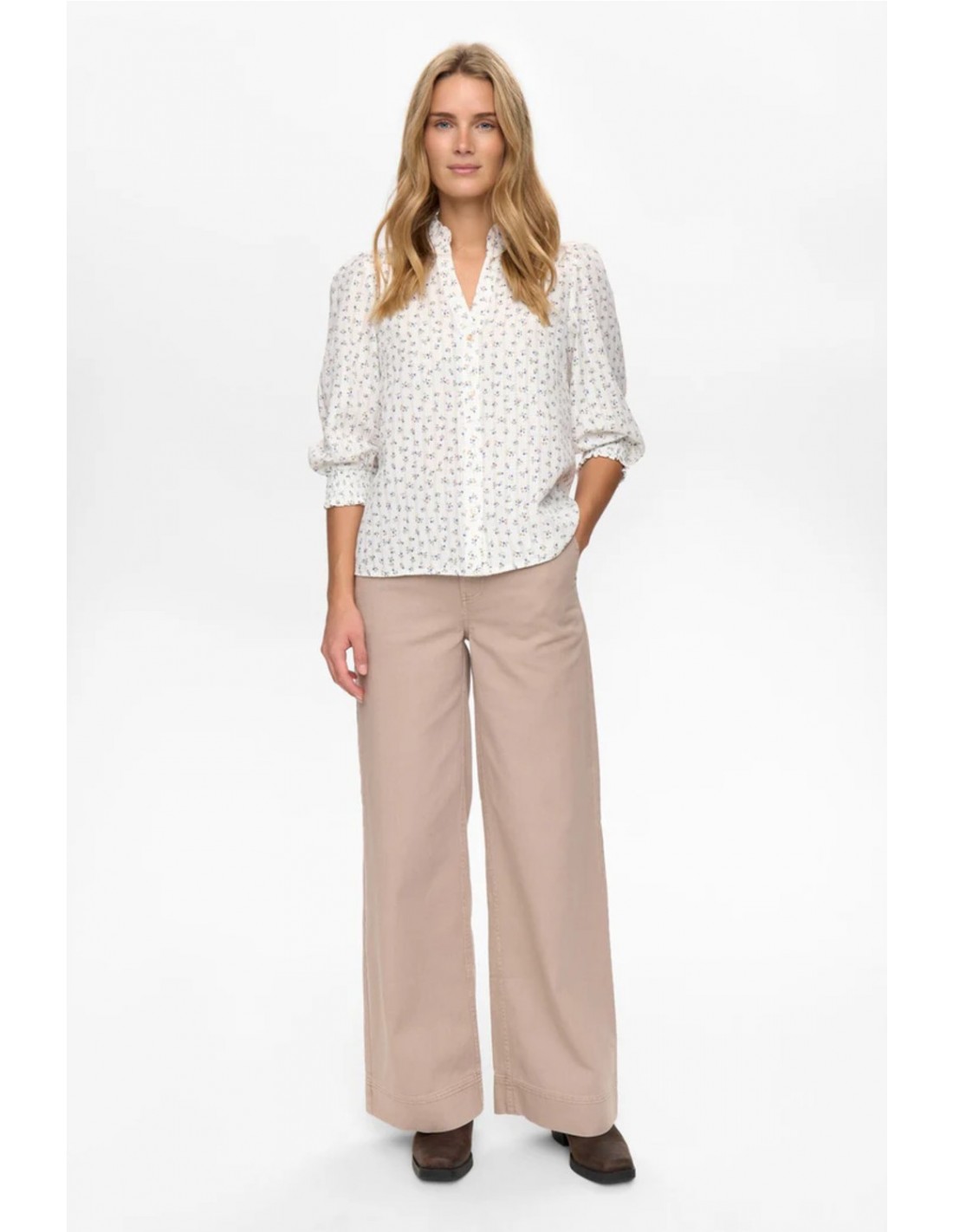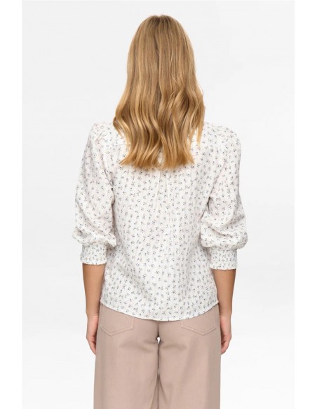 Camisa de manga afarolada y puño con goma. Corte recto. Cuello mao con ribete y abotonadura central. Con un hilo lurex muy ligero. Composición: 50% algodón y 50% poliéster.