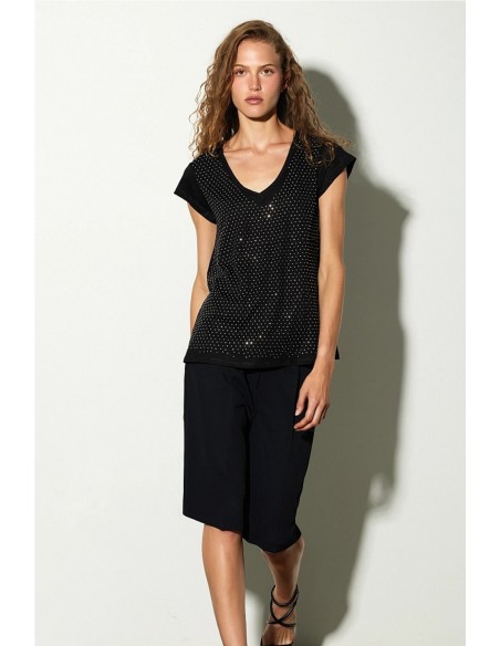 Camiseta de manga corta, cuello en V con strass y corte regular. Composición:50% algodón y 50% modal