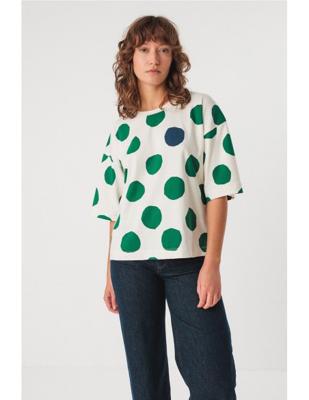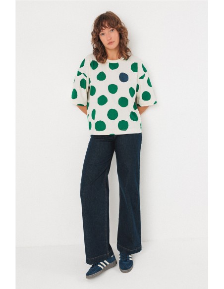 Camiseta amplia de cuello redondo y manga corta. Composición: 100% algodón orgánico con certificado GOTS.