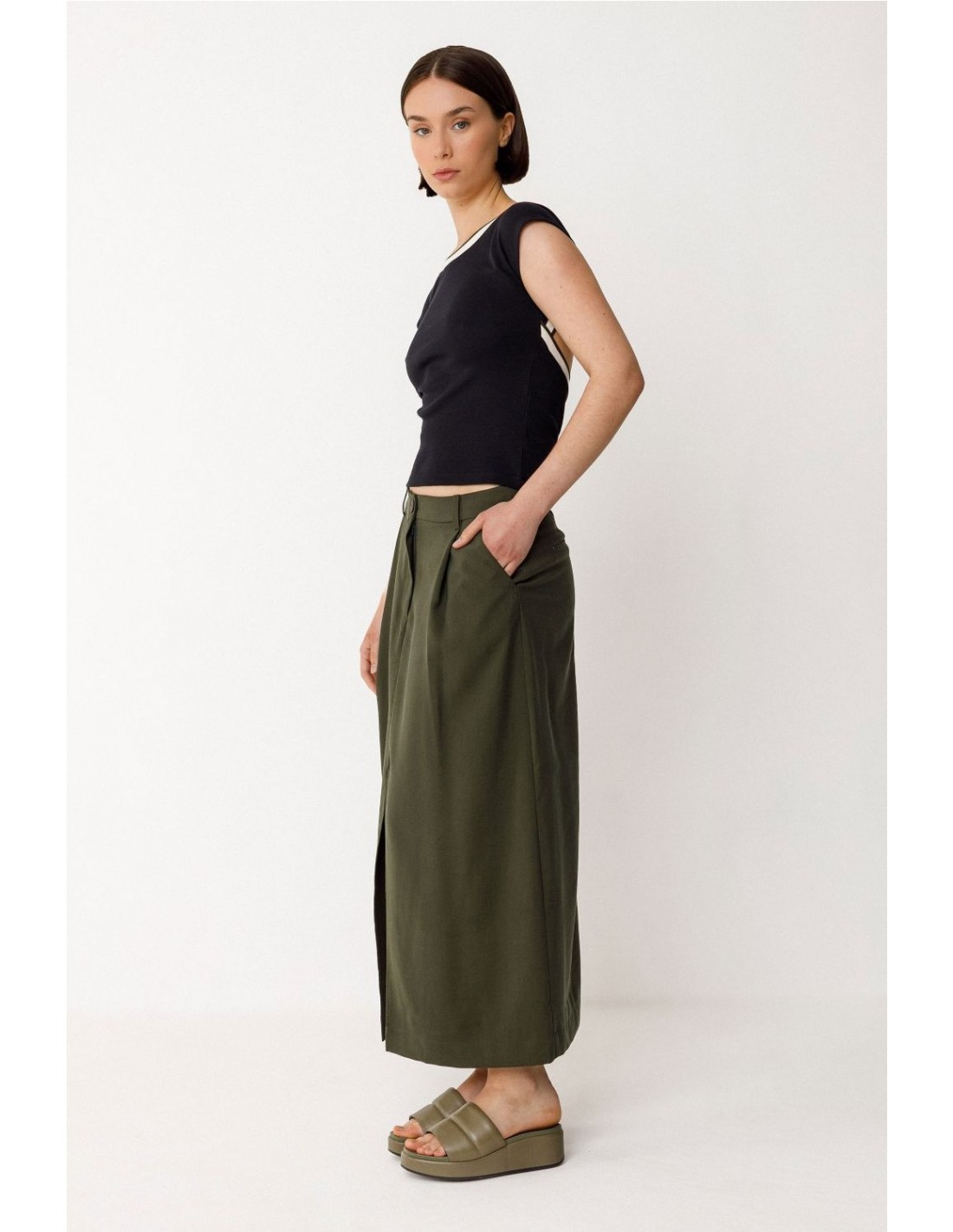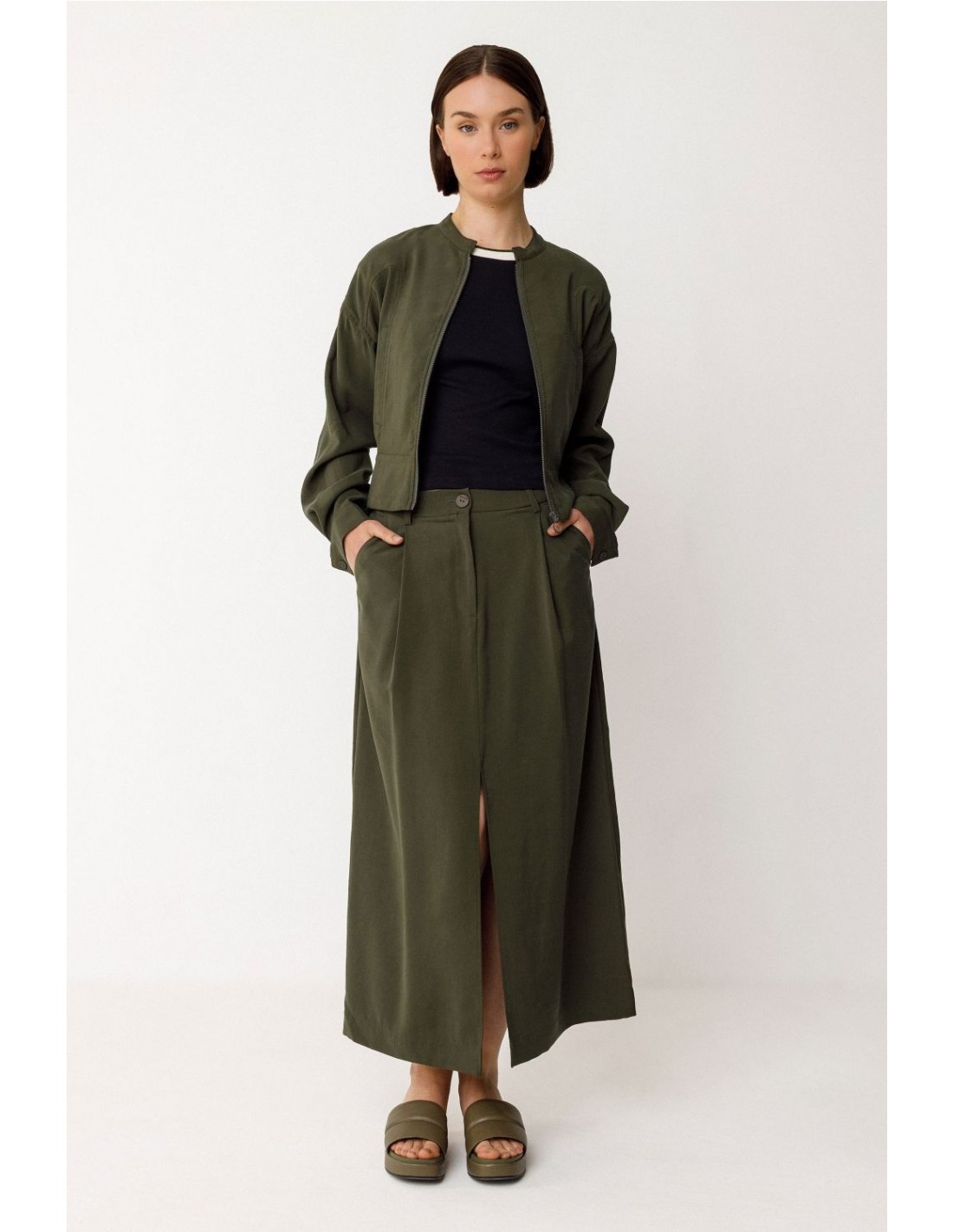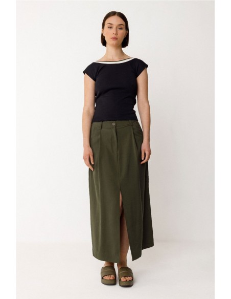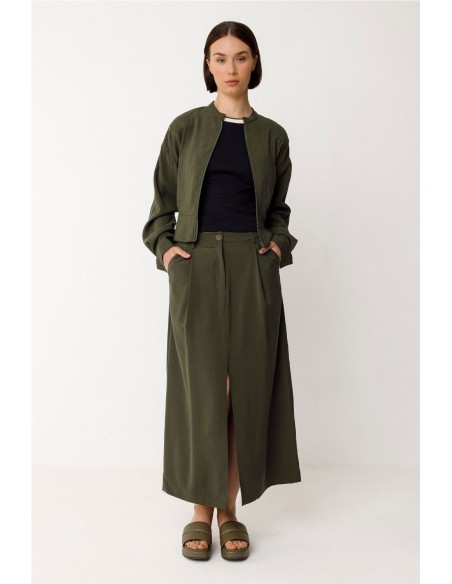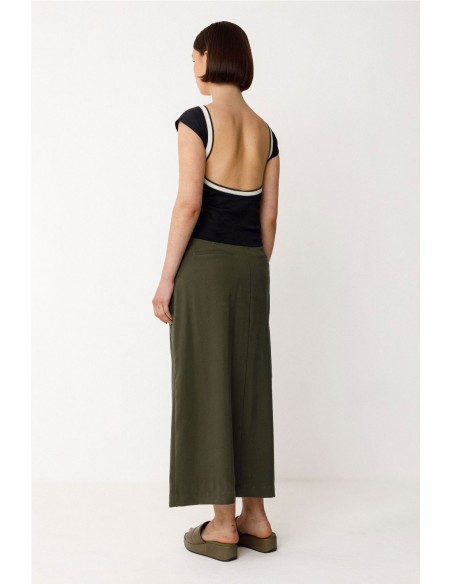 Falda midi de corte acampanado con abertura delantera. Bragueta de cremallera y bolsillos al bies delanteros. Composición: 91% viscosa y 9% poliéster (Lenzing EcoVero).