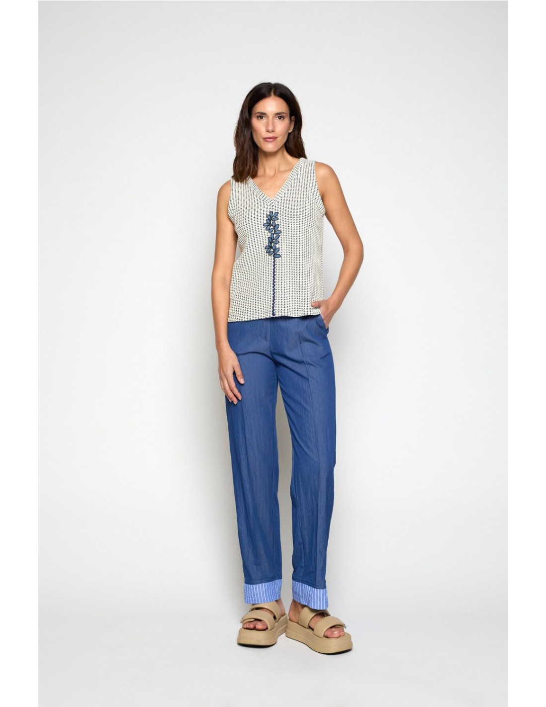Pantalón sport confeccionado en tejido vaquero finito. Cierre cremallera y botón de pasta. Bolsillos laterales y detalle de falsos bolsillos en la trasera. De pata recta con bajo interior en contraste en tejido de rayas. Composición: 65% viscosa y 35% poliamida.