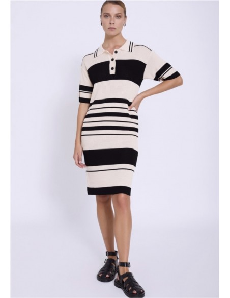 Vestido midi de punto piqué con motivo de rayas en contraste, con manga corta y cuello de polo con ribete. Corte recto y abotonadura en el pecho. Compòsición: 80% viscosa y 20% poliamida.