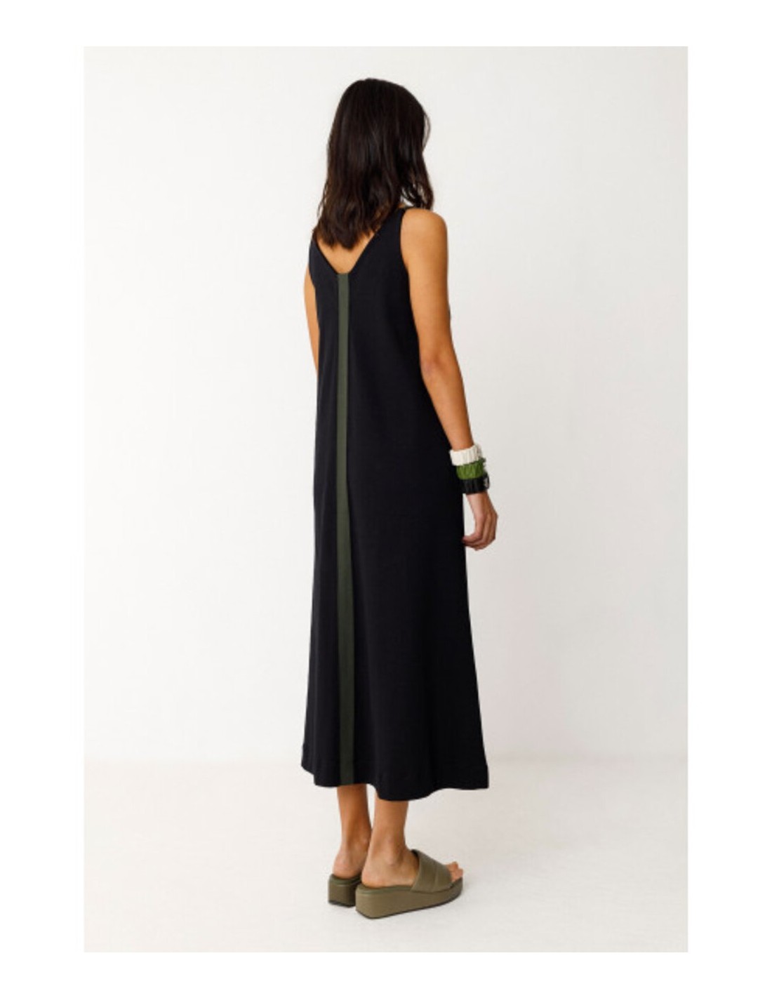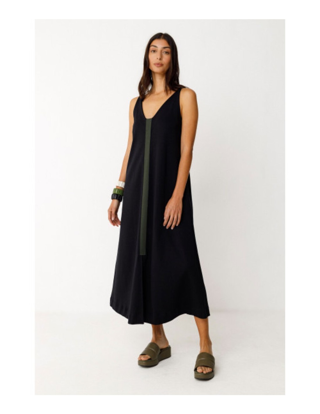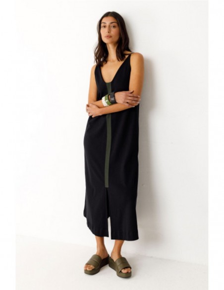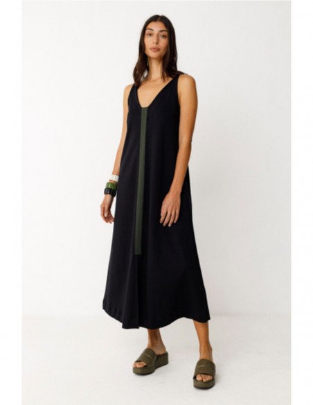 Vestido midi sin mangas de corte acampanado. Con cuello de pico y una apertura delantera, lleva un parche de color en contraste delante y otro detrás. Composición: 100% algodón orgánico con certificado GOTS.