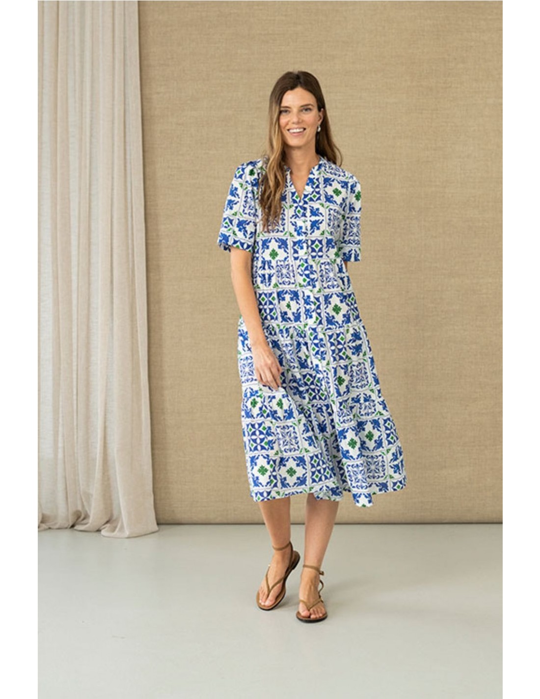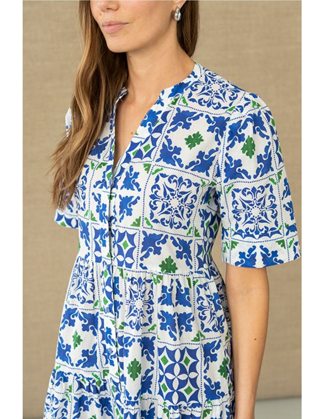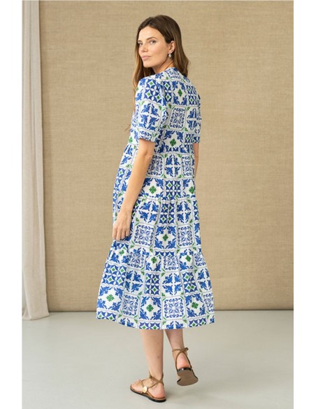 Vestido midi de corte fluido con estampado geométrico en tonos azules y verdes sobre fondo claro. Con escote en pico y manga corta. Corte bajo el pecho y bajo con volantes. Cintas decorativas en las costuras. Composición: 100% algodón