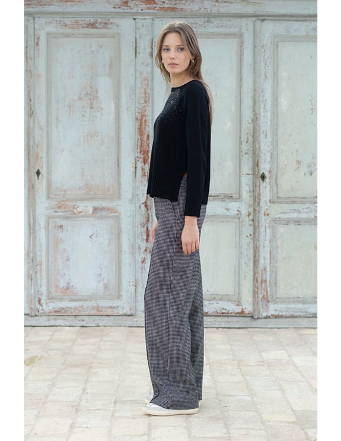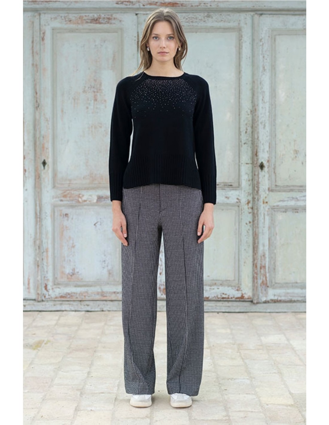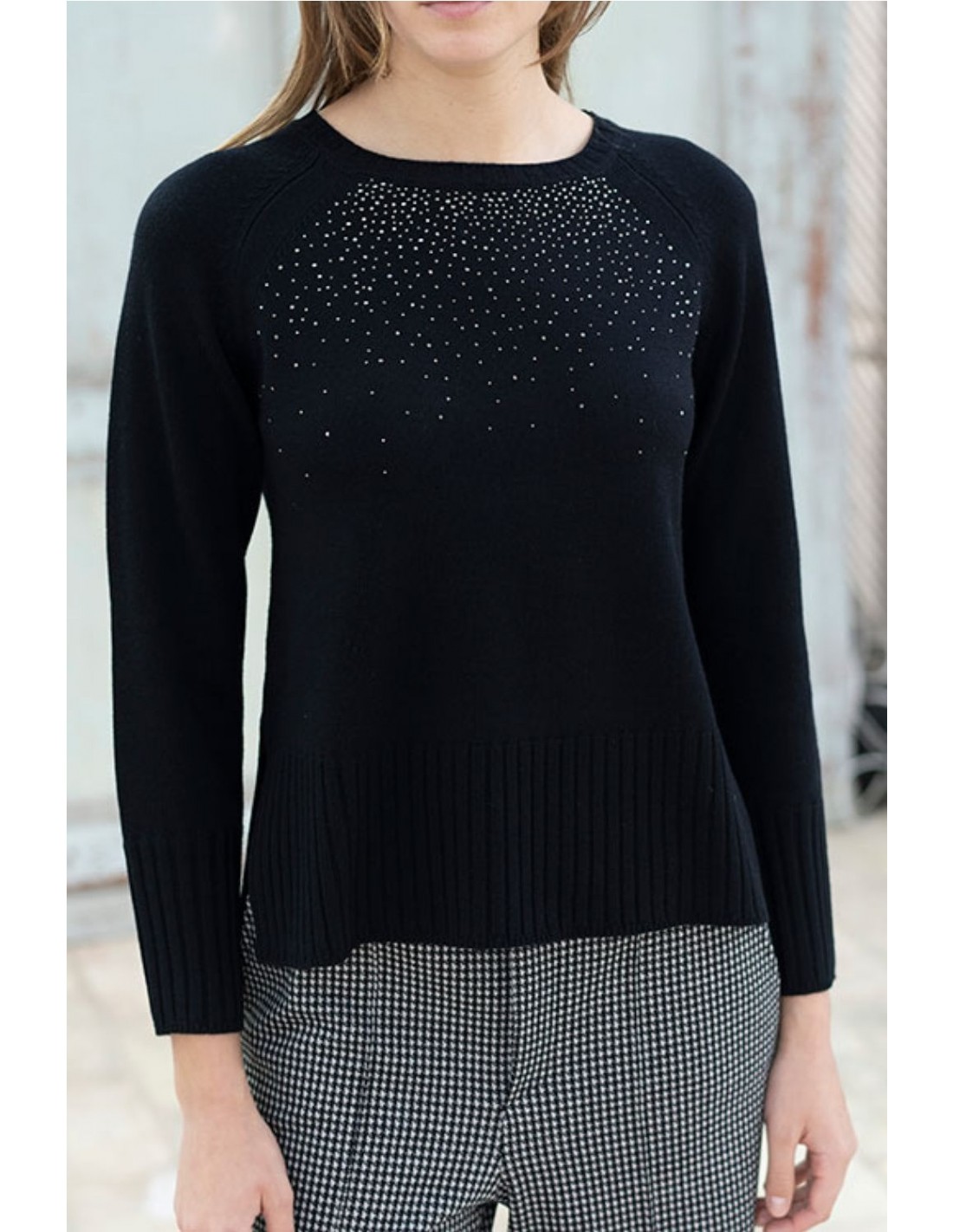 Suéter de punto finol, con delicadas aplicaciones de strass en la parte superior frontal. Presenta cuello redondo, mangas largas y acabado acanalado en puños y bajo, ideal para un look elegante y luminoso. Amplias aberturas laterales.